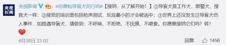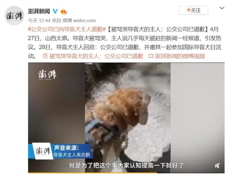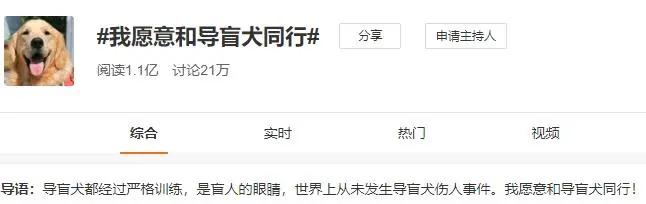 The related hashtags had attracted over 700 million views on Sina Weibo. Many netizens have called for enhanced public understanding of guide dogs and want to raise awareness about travel difficulties faced by visually impaired people.