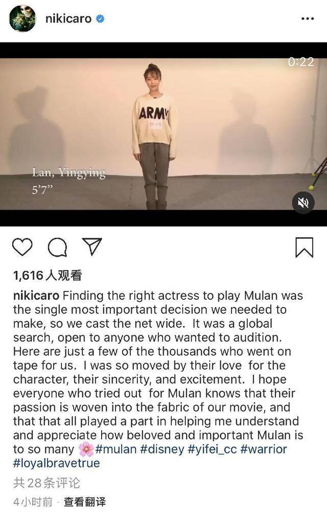 虽然,不少明星落选,成了陪跑对象,但妮基·卡罗感谢每一位参与试镜女演员的爱、真诚与兴奋。她表示,全球数千人为该角色录制了试镜视频,任何有意者都可参加,而每个人的热情都汇入了电影中,帮助她理解了木兰这个角色有多重要。