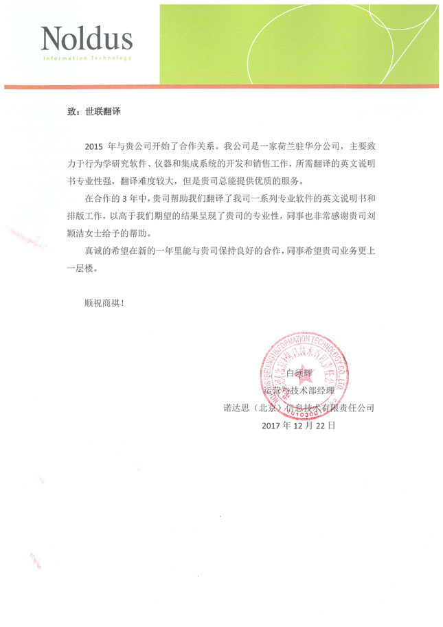诺达思(北京)信息技术有限责任公司致世联翻译一封信