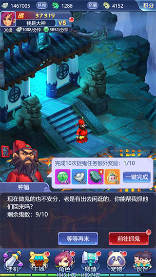 在与钟馗对话时,只需要点击前往抓鬼便可开始进行捉鬼任务。捉鬼有3种怪物,小鬼、变异鬼与鬼王,分别对应的是1倍、1.5倍和2倍奖励。