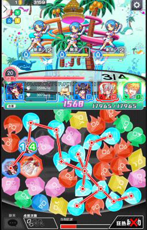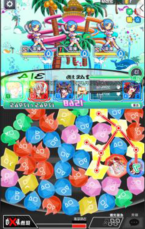 右下方能连击10个蓝色色珠生成粉碎色珠,可是左上方还有3个蓝色的色珠,如果能通过同时连击这些蓝色的色珠(连击超过12可产生炸弹粉碎珠),产生的炸弹粉碎珠将可造成更可观的输出和效果。