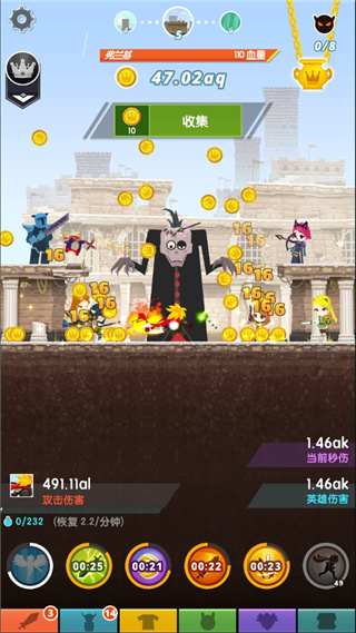 在蜕变完了的每一次开始阶段,用宝宝小凯为了溅射伤害快速推关。溅射伤害简单说就是当你的单次伤害大于当前怪物hp时,多出的伤害会以百分比作用于下一个怪物,甚至下两个,下三个,下四个怪物。当你无法一次击杀当前怪物时,把你的宝宝换成英雄加成类的。