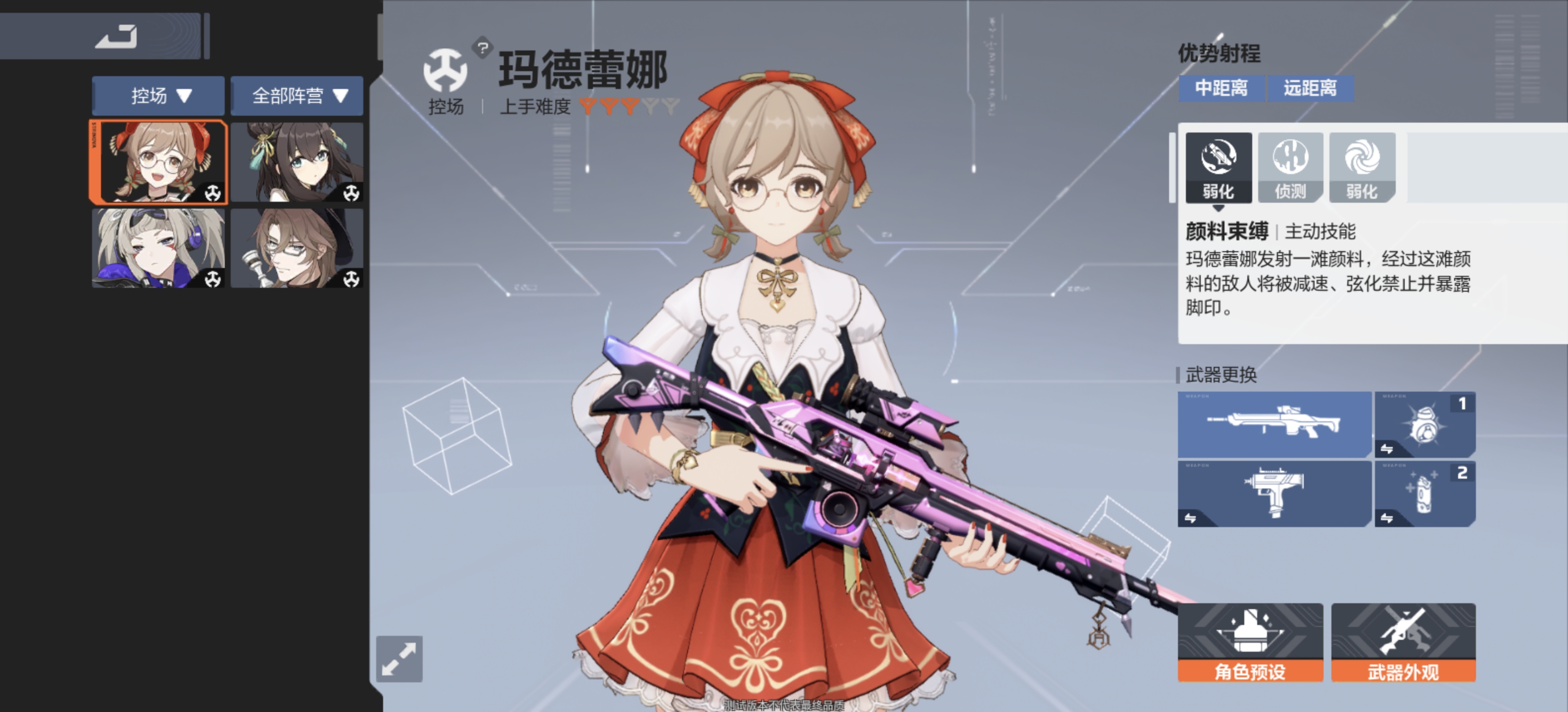 玛德蕾娜的技能是向前方发射一枚颜料弹,被颜料覆盖的地方,敌人接触后会减速,无法弦化并且暴露脚印,被动技能是主武器在命中敌人后,会造成减速且暴露脚印。大招是发射一个巨大泡泡,泡泡内的敌人无法弦化且暴露脚印,在泡泡爆炸后会给范围内的敌人施加减速和易伤效果。
