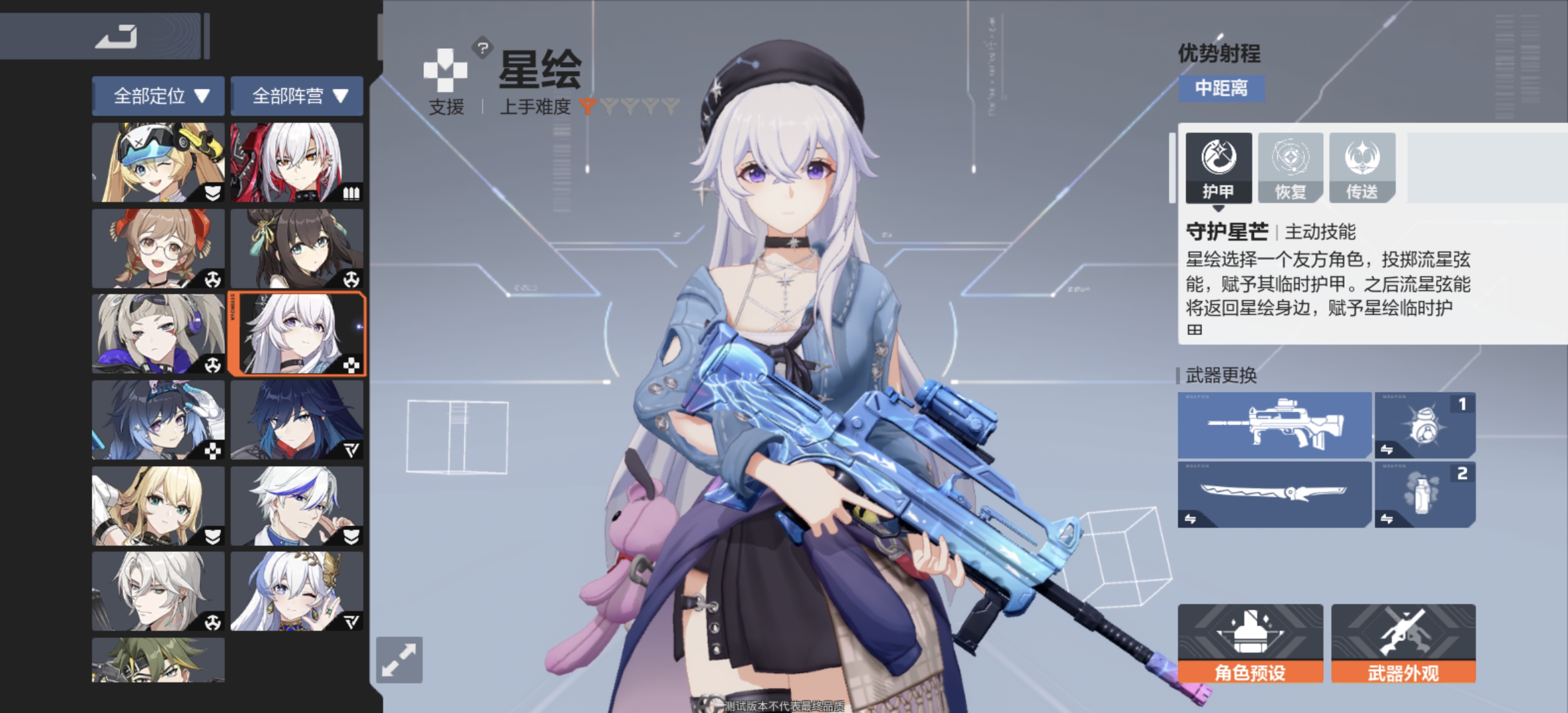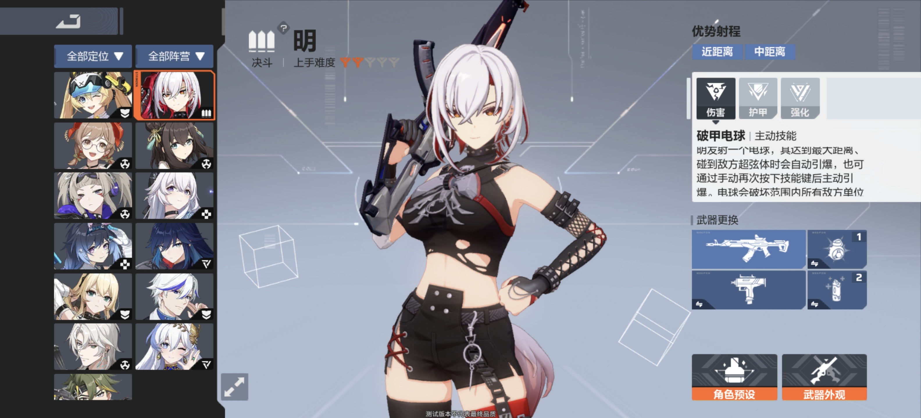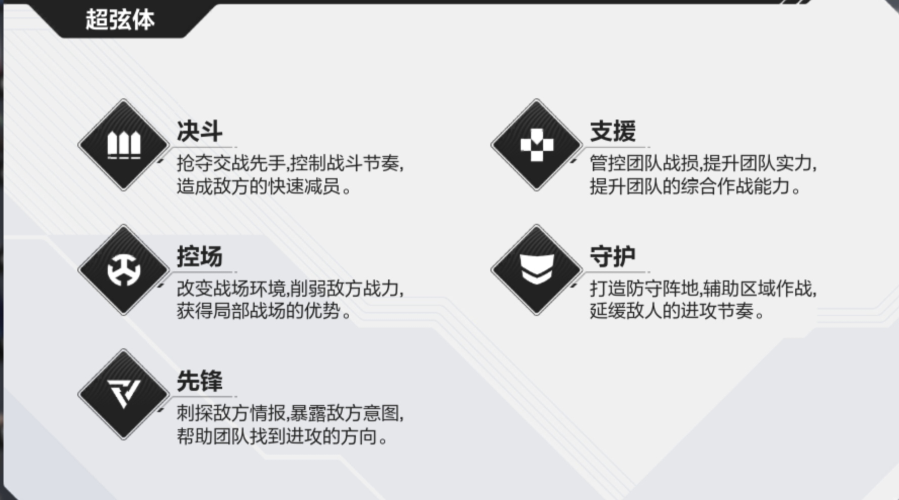在卡拉比丘当中,角色被称为超弦体,测试阶段目前只有13个角色,每个角色都有一把固定的主武器,然后是一把可选择的副武器,加两个可选择的投掷物,角色拥有主动技能,被动技能和大招,每个角色的技能都是不一样的,每个角色也有不同的定位,定位分为决斗、支援、守护、先锋、控场
