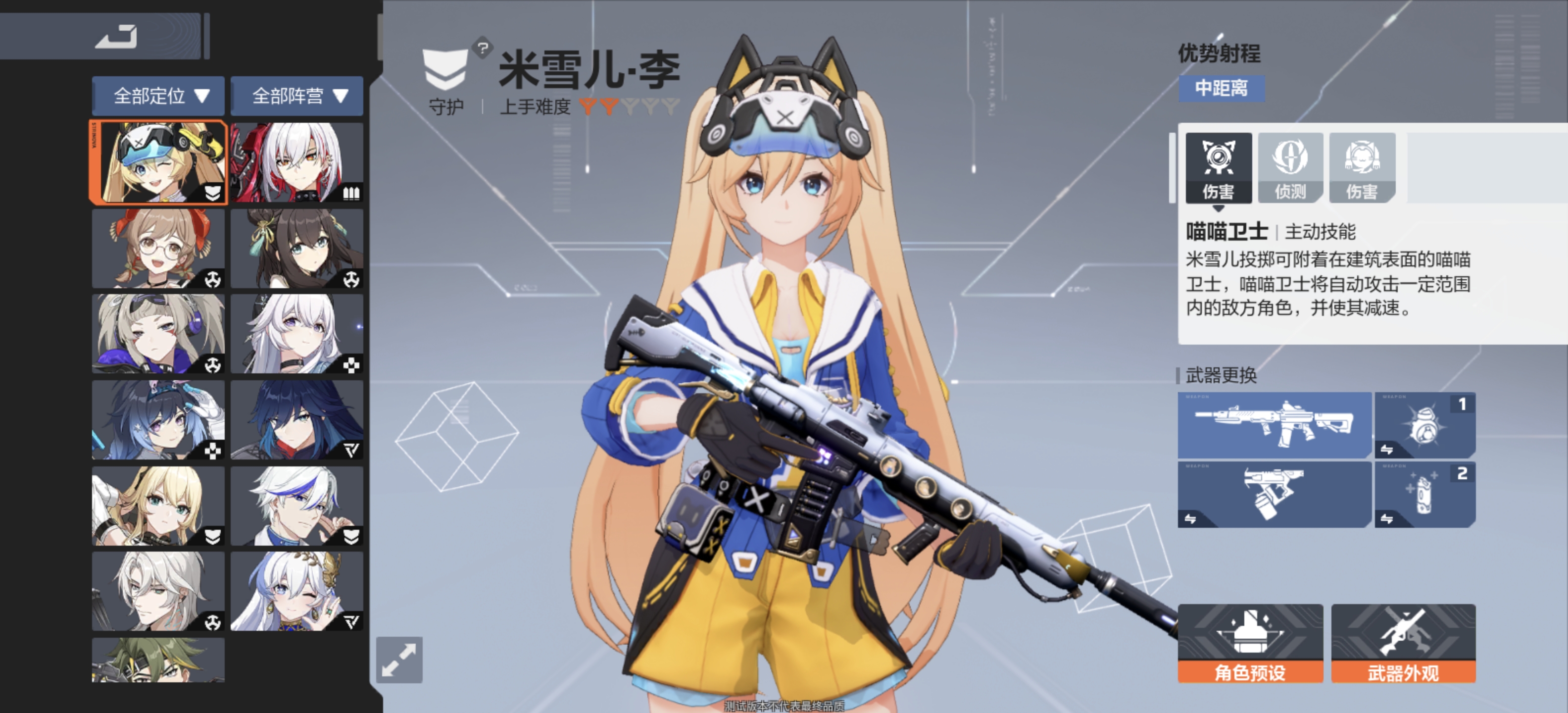 米雪儿可投掷一个能附着物体表面的喵喵卫士(类似于小防御塔),喵喵卫士会自动攻击一定范围内的敌人,并造成减速效果。大招是召唤火力大喵(喵喵卫士Promax)在范围内进行火力输出,被动技能可以短暂透视使用武器命中自己的敌人。