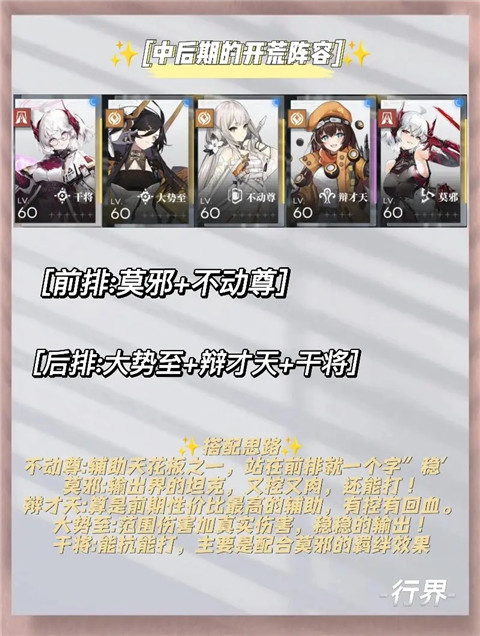 无妄是开局就有核心武卫,绝对的平民战神,能抗能打,给你后排稳稳的幸福;公输叠好大招,回血就会嘎快,非常适台当前排;辨才天算是前期性价比最高的辅助,有控有回血;徵羽和赤霄,选徵羽主要是配合赤霄,赤霄输出效果非常炸裂,值得一试。