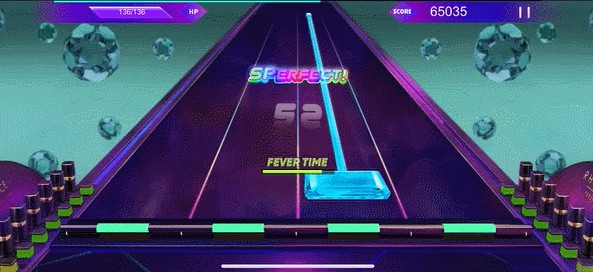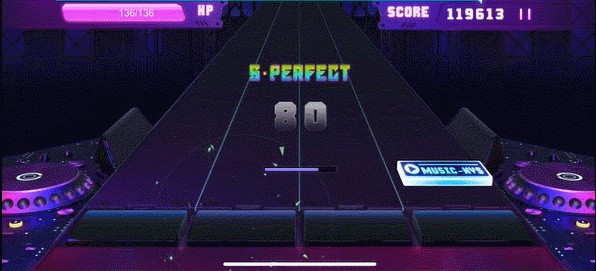 2、上方会不断掉落音符,根据音符的位置和节奏,准确地点击、长按或滑动相应按键。