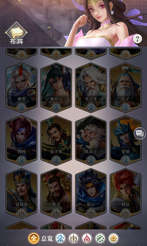 1、游戏内有着云渊、武境,灵州,岚谷,神庭五大阵营英雄,还分为攻、突、防、辅四种职业类型