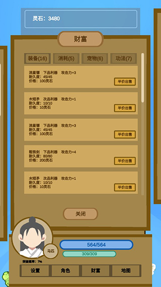 玩家点击下方财富即可查看自己拥有的装备、消耗品等等。