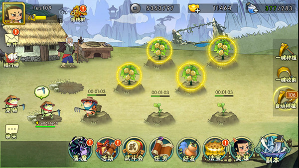 2、等到种子成长成熟之后,我们就可以收割获取相应的道具了。当然,在我们通关相应的副本之后,还会开启相当方便的一键种植和一键收割的功能呦。