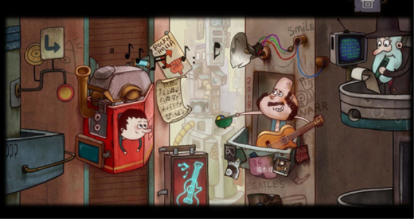 刚刚到达七层,映入眼帘的是一位歌唱家在弹着吉他唱歌,可惜喇叭坏了,乐谱也坏了;