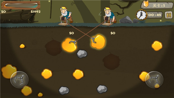 6、在游戏界面有两个按钮可以控制游戏中的两个人物的抓钩;