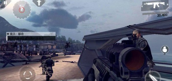 1、一段动画过后,正式开战,主角们进入到沙滩后,前面有一堆敌人正在向你们射击,清除完这堆敌人后,上台阶,跟着人物头上显示跟随的士兵走,一直来到新的区域,这里敌人的炮火很密集,不要硬拼,跟随并往右侧移动,上阶梯和三角洲部队汇合后,进入山里,会自动切换成无人机操作,控制无人机一路扫射敌人,在这里提醒下玩家无人机也是会被击破的,无人机被RPG轰爆之后,镜头切换到主角等,由于前方已被无人机摧毁,所以一路尽情向前狂奔,上楼后开始进入剧情动画。