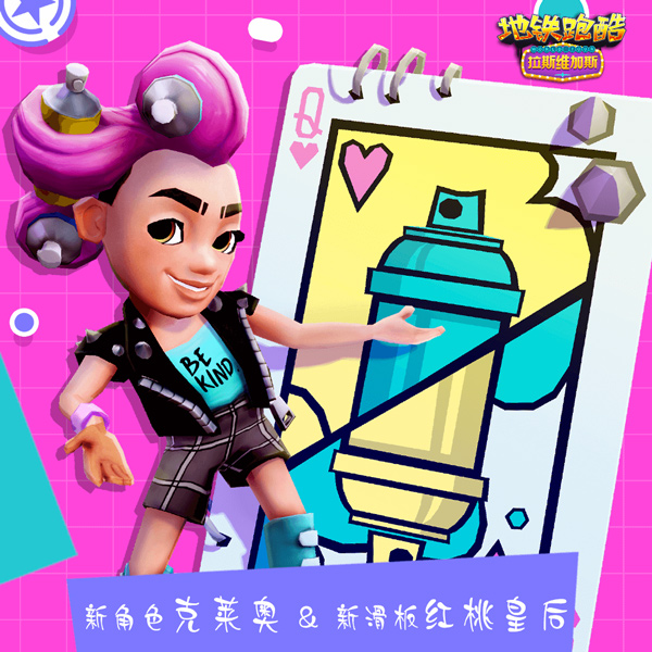 拉斯维加斯女孩「克莱奥」造型前卫酷炫,常用跑酷者的方式去认识些新朋友。这次有「红桃皇后」滑板的同色系搭配,「克莱奥」的魅力将如地心引力般更吸引经过不夜城的每个人!