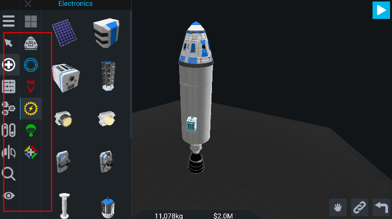1、进行坎巴拉太空计划游戏,我们首先需要学会制作宇宙飞船推进器,推进器有多种组装形式,我们可以组装成我们觉得炫酷的推进器,合适的搭配才能够避免火箭解体,尾翼可以帮助我们控制火箭。