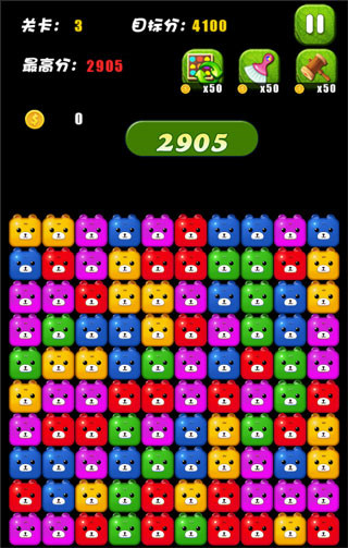 2、碰碰熊:经典消灭星星玩法,点击两个或两个以上的彩熊即可消灭得分。