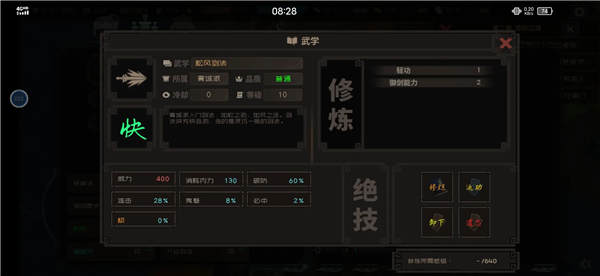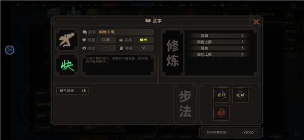 拥有正—刚—快—险—奇—煞—慢—柔—妙—正9种,每种武学需要相对应的势气值才能出招),战斗界面左右两边人物状态栏会显示势的多少,出招可以选择集势(增加自己的势方便出武学)、降势(降低对面势,让他只能普攻)两种方式,相克属性的武功造成伤害+50%,每个回合自身累计势额外增加,每场战斗会累计势气(具体不知道多少),达到一定数值会触发武学对应属性的特殊效果(比如累计势是100,每个回合自身集势10,那么10个回合后出发特殊效果),例如险:下个回合攻击暴击+20%(其他的点击所学势,右边会刷新介绍),越高越好。