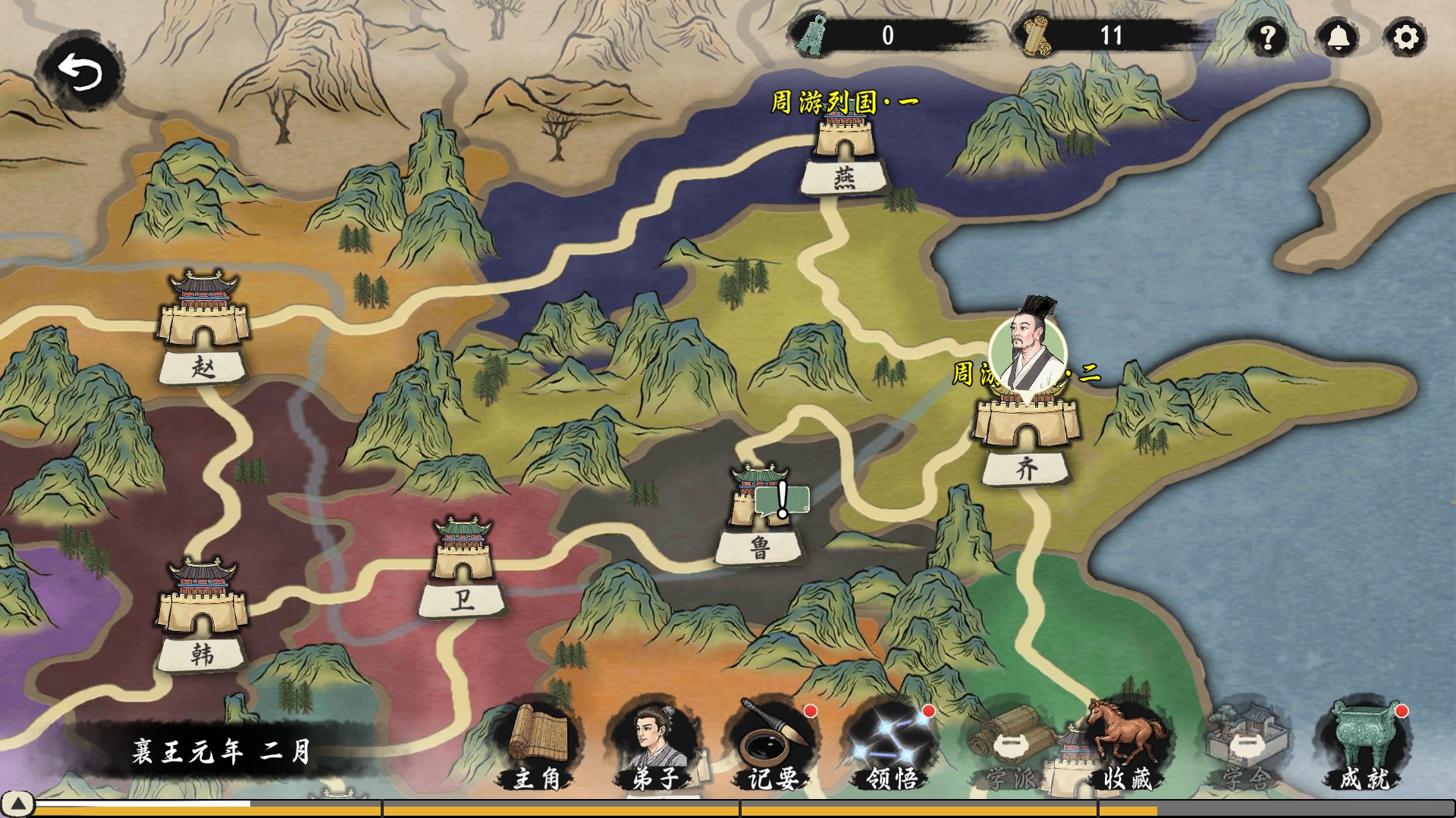 1、沉浸式国风体验:水墨丹青绘制列国风光、诸子形象,搭配编钟古乐与竹简文字特效,还原春秋战国文化质感,每处场景都暗藏文化细节彩蛋。