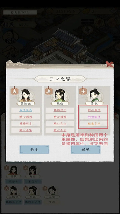 别生小孩!别生小孩!别生小孩!因为生出来的小孩都是单属性的(没遇到过双属性),培养的属性如果是两个单属性中的一种就还好,如果不是,那这个孩子就真的很拉胯。父母的属性都挺好,结果生了个拉胯孩子,如果赶走的话父母也要跟着走,如果留着又挺碍眼,所以不如不生。如果真的很想生,就等后面房屋全部升级了,有空地了再生。(大后期房屋容纳的人数>做工干农活需要的人数)