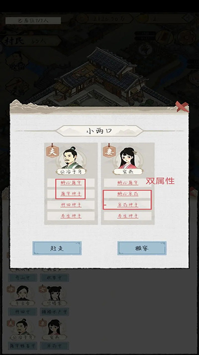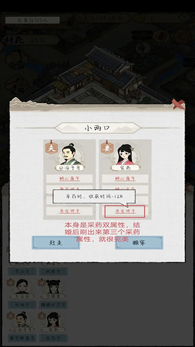 我试了一下把单身汉都放一个屋子,结果就是谁也看不上谁。如果一个屋子里有夫妻,再放两三个单身汉就比较容易成功。配对的时候尽量让至少一个村民是种田/采药的双属性,因为他结婚之后有小概率能刷出来第三个相同的属性(捕捞和屠宰的第三属性我没刷出来过,不知道是否存在)。做工属性的村民,举个栗子,砍柴+种田,就算结婚之后刷出来种田buff,也不是三属性,所以尽量不要让两个做工的村民配对,意义不大。做工+农活双属性,结婚之后又刷出来相同的农活属性,这种情况我还没遇到过。