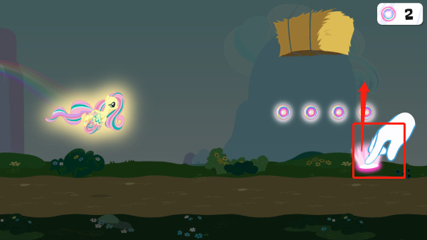 6、拾取彩虹能量后,可进入飞行状态,皆是玩家需要通过向上或向下滑动屏幕,拾取小马能量获得更多的得分。