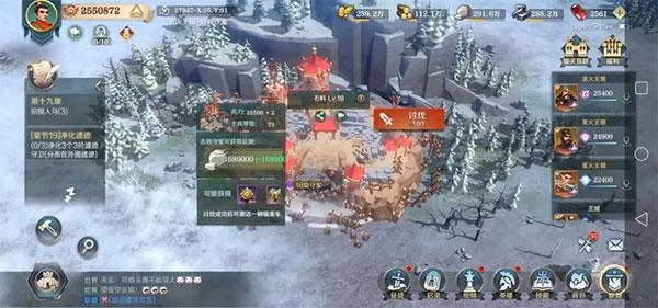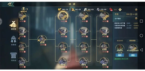 在队伍清理黑鸦叛军时,我们可以同时点开建筑列表,根据主城升级提示,迅速布置建筑,完善内政的发展。
