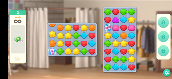 1、游戏分为两个部分,首先是简单的三消闯关,通过移动方块来将方块连在一起消除。