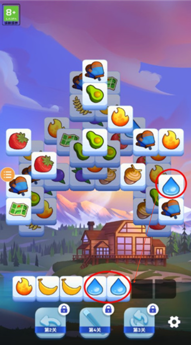 1、基础消除操作:玩家通过点击屏幕,将三个相同的方块放置于屏幕下方的卡槽中完成消除。比如出现三个相同的胡萝卜图案方块,点击它们放入卡槽就能消除。
