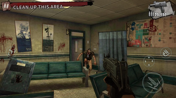 游戏操作还是比较符合大众玩家需求的,采用全屏触控来控制瞄准方向,在右下角有射击按钮、切换弹夹以及瞄准按钮,玩家们可以较为轻松的控制。本作中主角是固定不动的,我们只能控制视角的移动以及瞄准和射击,这种战斗方式虽然无法与《城市战争》这种超自由度的射击作品相比,但是就操作而言,这种固定的方式反而更强容易控制。