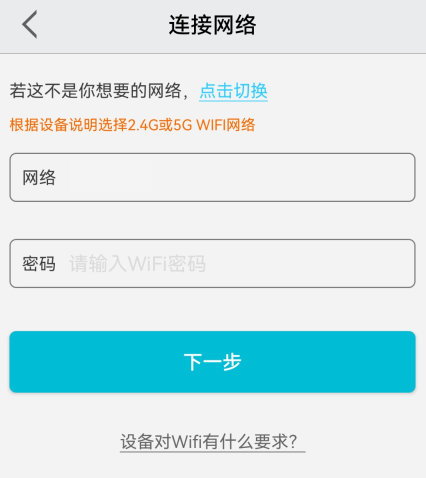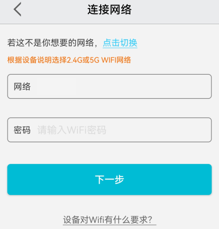 输入网络密码后点击下一步,连接设备热点后跟着指引继续操作。