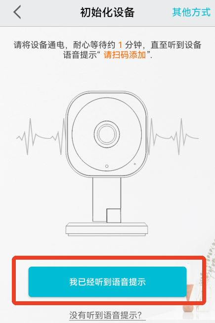 1)将设备通电后听到“请扫码添加”,就可以点击【我已经听到语音提示】。