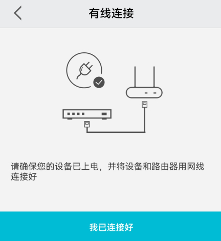 1)首先确保设备已经连上电源,设备和路由器也需要用网线连接好。点击【我已连接好】。