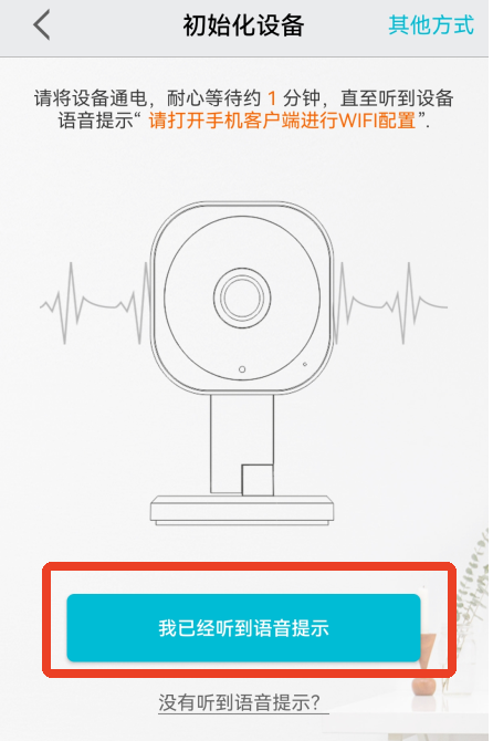 设备通电后听到“请打开手机客户端进行WiFi配置”就点击下方的【我已经听到语音提示】。