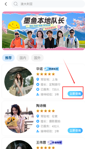 4、通过浏览队长信息选择合适人选后,点击立即咨询便可获得专业的行程建议与详细解答。