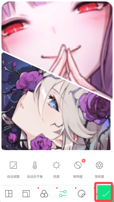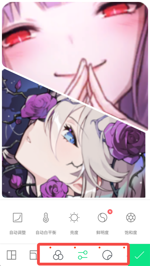 5、点击下方图标,可以调节图片的亮度、饱和度等,还可以添加各种滤镜、贴纸。