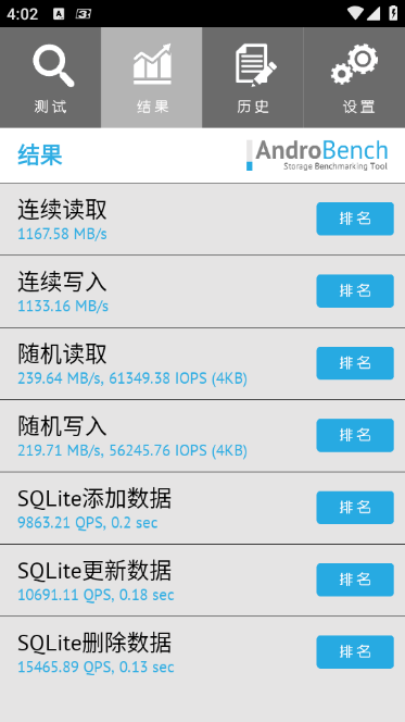 AndroBench是一款可测试手机存储性能的实用工具,具备丰富测试模式,能对顺序读写速度与随机4K读写性能进行测试,无需root权限即可使用,适用于游戏或高频数据处理场景,所有功能均可免费使用,可帮助用户了解手机存储性能表现,为优化手机使用提供参考,能让用户更好地应对不同使用场景需求 。