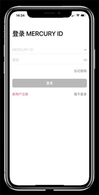 下载安装水星安防app,打开MERCURY安防APP,输入MERCURY ID的账号和密码,点击 登录。如果没有MERCURY ID,请点击 新用户注册,按照提示注册MERCURY ID,如下图: