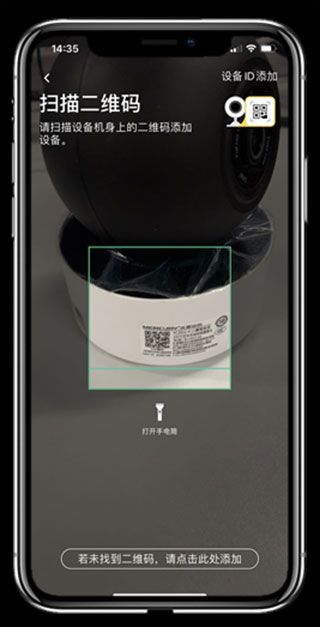 登录APP后,摄像机在出厂状态下上电后红绿灯交替闪烁,在APP上点击 设备 主界面右上角的“+”,扫描无线网络摄像机机身上的二维码,如下图: