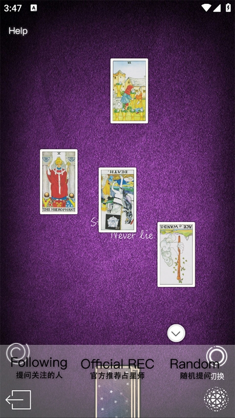 3、高清塔罗牌动画界面:软件内的高清塔罗牌翻牌动画界面流畅且精美,提升了用户的占卜体验。