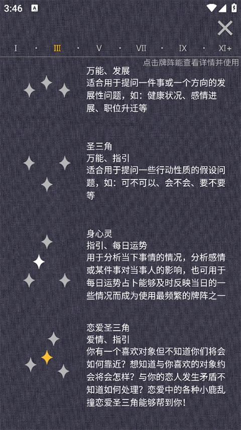 1、个性化定制体验:软件支持根据用户需求定制占卜体验,用户可以选择不同的占卜模式和背景,以满足个性化需求。