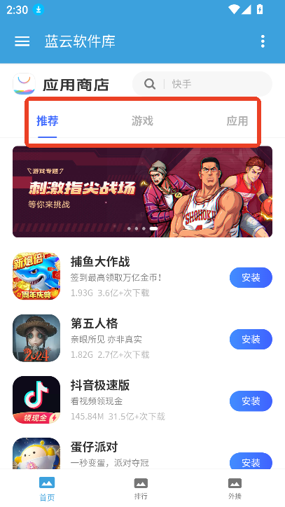 进入首页,可以选择推荐,游戏,应用等几个板块