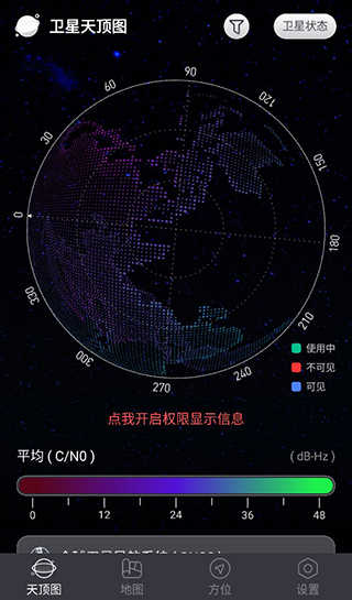 用户点击天顶图,即可查看卫星天顶图,每一个卫星的方位和状态都会显示在地图上。