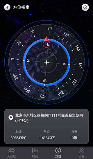 用户在方位页面可以查看自己当前的方向位置以及经纬度,点击右上角瞄准图标可以进行水平校准。