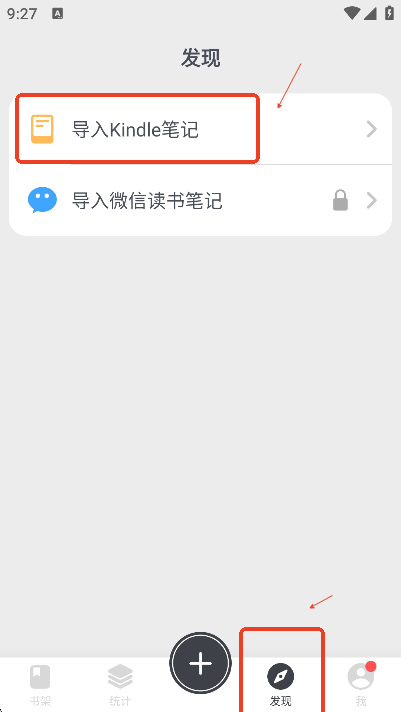 用户们还可以使用kindle笔记导入功能,只需要点击发现板块的”导入kindle笔记“