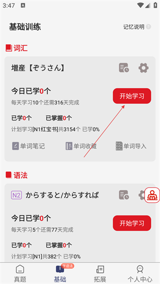 2. 在基础训练页面,找到【词汇】板块,点击相应的【开始学习】按钮,即可进入待学习列表。