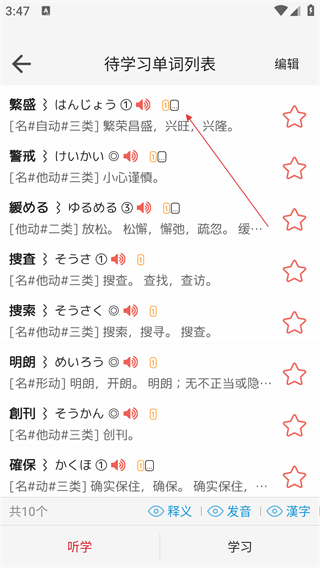 3、于【待学习单词列表】里,挑选单词进入详情页面,便能查看单词的发音、释义等相关信息。