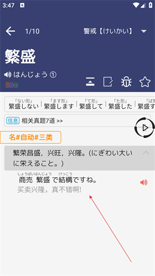 4、进入单词详情页,能查看单词的变形形式与例句,点击音频按钮即可收听发音。