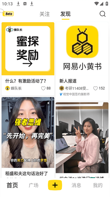 网易小蜜蜂是网易开发的年轻化内容社区应用,作为年轻人分享生活日常的社交平台,它以双列瀑布流形式展示内容,能让年轻用户便捷地浏览和分享各类生活点滴,为年轻人提供了一个展现自我、交流互动的空间,在这里他们可尽情记录生活中的精彩瞬间,发现更多有趣的人和事,满足年轻人对社交和内容分享的需求。
