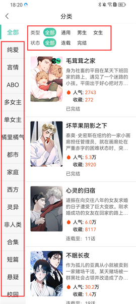 4、于【分类】板块,依据不同的题材类型和更新状态,对所有漫画展开细致分类,以方便用户能够快速筛选。
